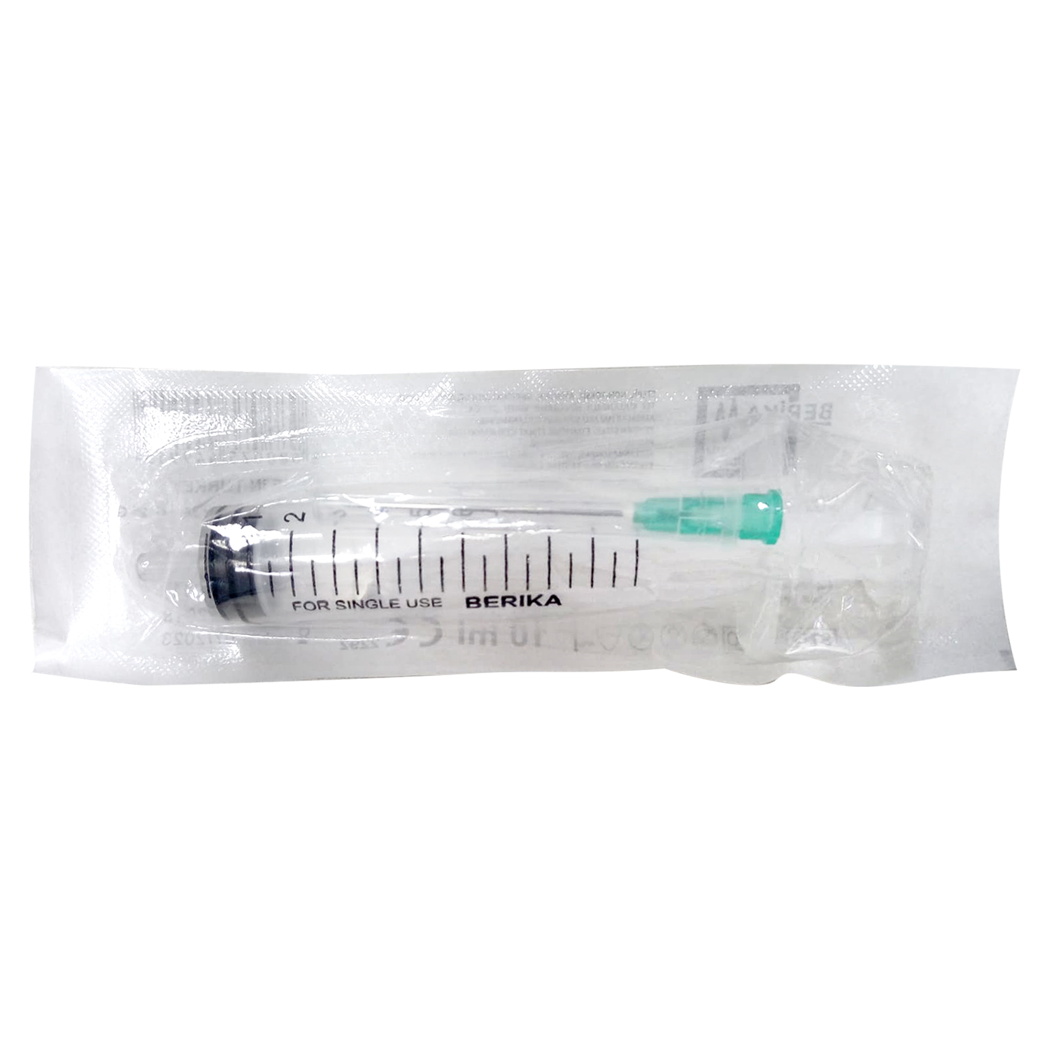 Berika Enjektör 10 cc 3 Parça Yeşil. Bireysel kullanımlar, evde bakım süreçleri ve spesifik klinik uygulamalar için ideal 10 cc geniş kapasite; 21G (yeşil) iğne ucu ve sızdırmaz kauçuk contasıyla (3 parça) pürüzsüz sıvı transferi sağlayan, steril, tek kullanımlık yerli üretim profesyonel medikal sarf malzemesi.