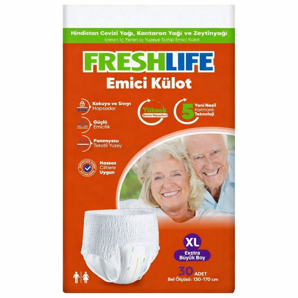 Freshlife Emici Külot xLarge 30'lu. İdrar kaçırma problemi yaşayan yetişkinler için maksimum konfor sunan külot tipi bez; yüksek emiş gücü, sızdırmaz kenar bariyerleri ve vücuda tam uyum sağlayan esnek yapısıyla hem hareketli hastalar hem de yatalak bireyler için ideal, koku önleyici özellikli 30 adetlik ekonomik paket.