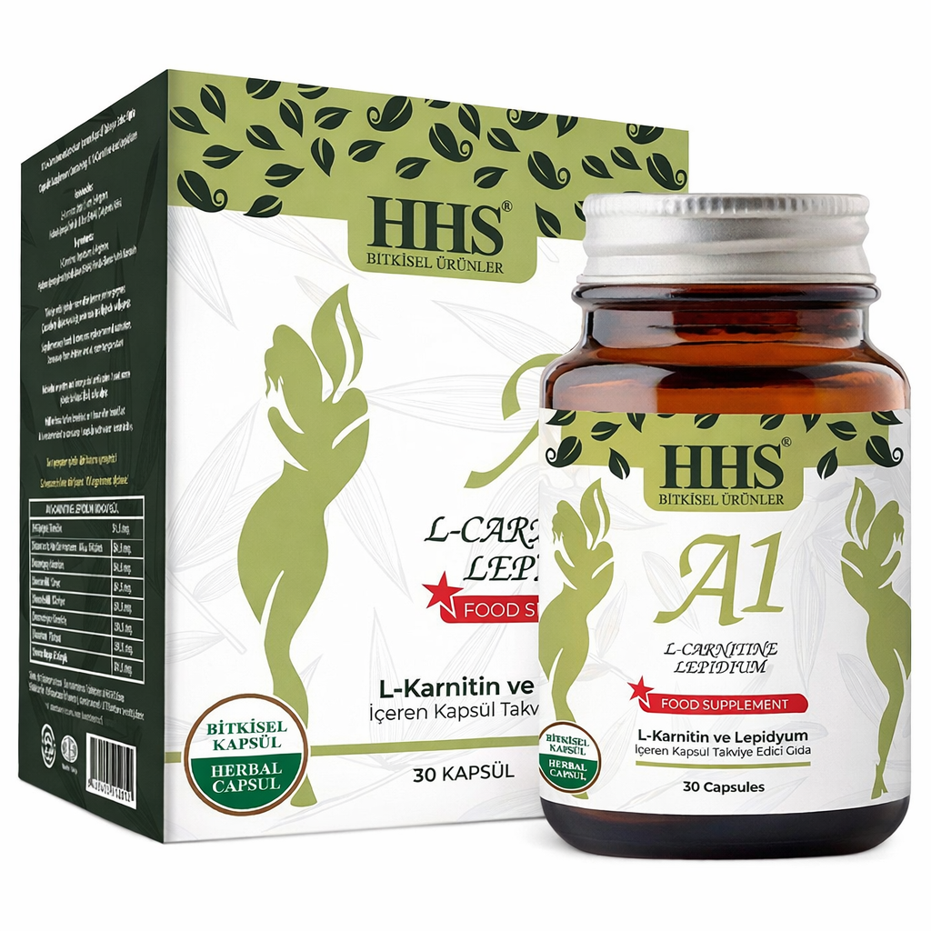 HHS A1 L-Carnitine Lepidium 30 Bitkisel Kapsül. L-Karnitin, Lepidium (Maca Kökü) ve yeşil çay ekstresi ile zenginleştirilmiş; spor ve diyet programlarınıza destek olmak üzere formüle edilmiş, cam şişede sunulan takviye edici gıda.