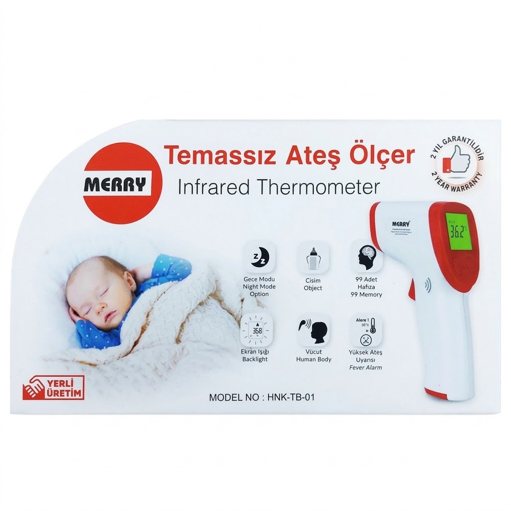 Merry Temassız Ateş Ölçer. Hijyenik ve hızlı bir şekilde ateş takibi yapabilmek için geliştirilmiş dijital termometre; cilde temas etmeden ölçüm yapabilme özelliği sayesinde enfeksiyon riskini minimize eden, bebeklerden yetişkinlere tüm aile bireyleri için uygun olan ve pratik tasarımıyla evde sağlık takibini kolaylaştıran modern sağlık asistanı.